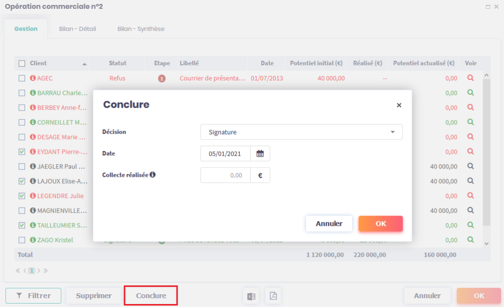 De plus, il dispose d’une fonctionnalité permettant d’effectuer des traitements par lots sur plusieurs clients afin de conclure l’opération commerciale qui les concerne, de la même façon (signature, refus..). Concrètement, cette fonctionnalité peut s’avérer utile à la fin de la campagne d’une opération commerciale afin de traiter rapidement les clients qui n’ont pas donné suite, ont exprimé un refus etc. Il suffit de cocher la case des clients concernés puis de cliquer sur le bouton Conclure. Dans la fenêtre qui s’ouvre, sélectionnez le type de la conclusion, la date puis le montant de la collecte réalisée (montant total).