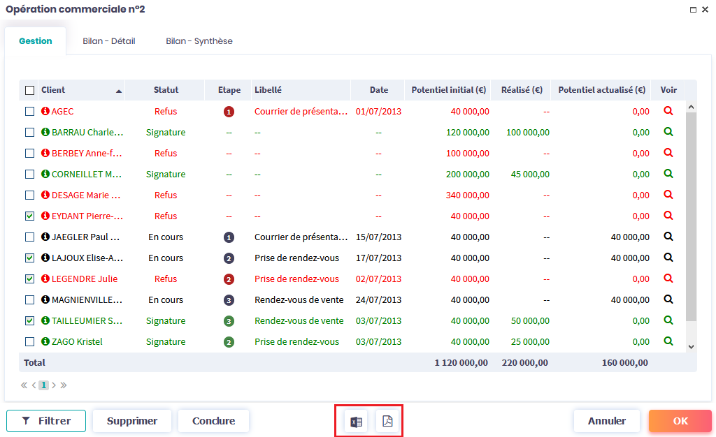 - la partie centrale vous présente le bilan « numérique » (en nombre de clients) de l’opération commerciale,