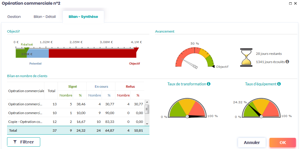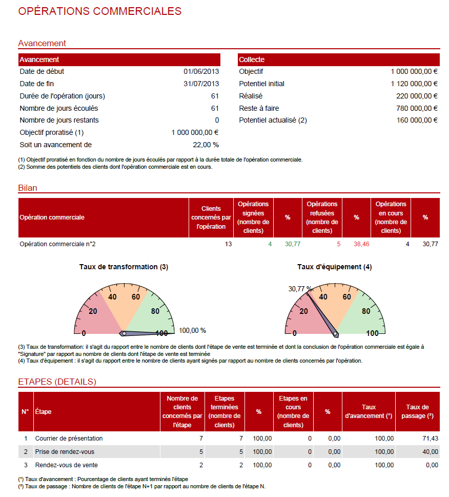 Plusieurs opérations commerciales peuvent être lancées simultanément. Des indicateurs vous permettent d’une part, de connaître en temps réel l’évolution des actions entre les différentes étapes et d’autre part, les résultats chiffrés des opérations (montant réalisé par rapport aux objectifs). A tout moment, le responsable peut visualiser l’état d’avancement des objectifs des conseillers dont il a la charge.
