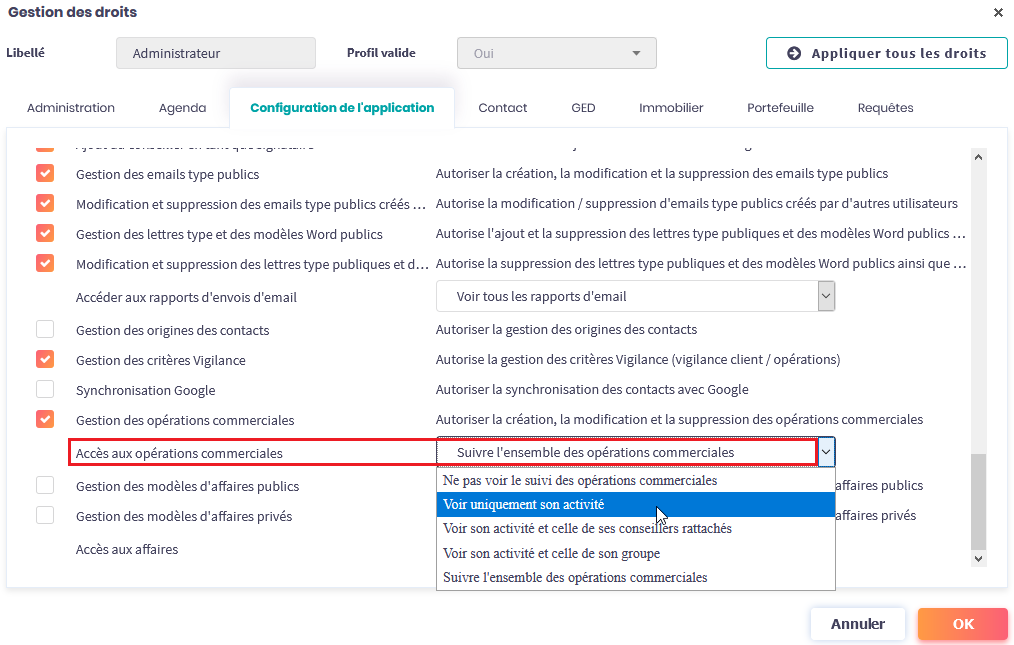 L’utilisation de la fonctionnalité liée aux opérations commerciales est dépendante de la structure hiérarchique déjà mise en place dans votre structure, mais également de deux droits spécifiques qui leur sont propres.