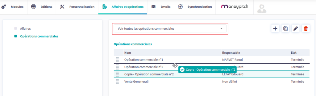Par défaut, les opérations commerciales sont triées par ordre de création, ce qui est d’ailleurs l’ordre repris sur la page d’accueil. Pour le modifier à votre convenance, sélectionnez une opération commerciale puis cliquez-là et déplacez-là vers le haut ou le bas tout en gardant le doigt enfoncé sur la souris. Une fois l’opération positionnée à la place que vous souhaitez lui attribuer, relâchez le bouton de la souris.
