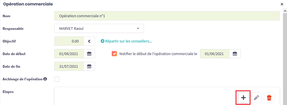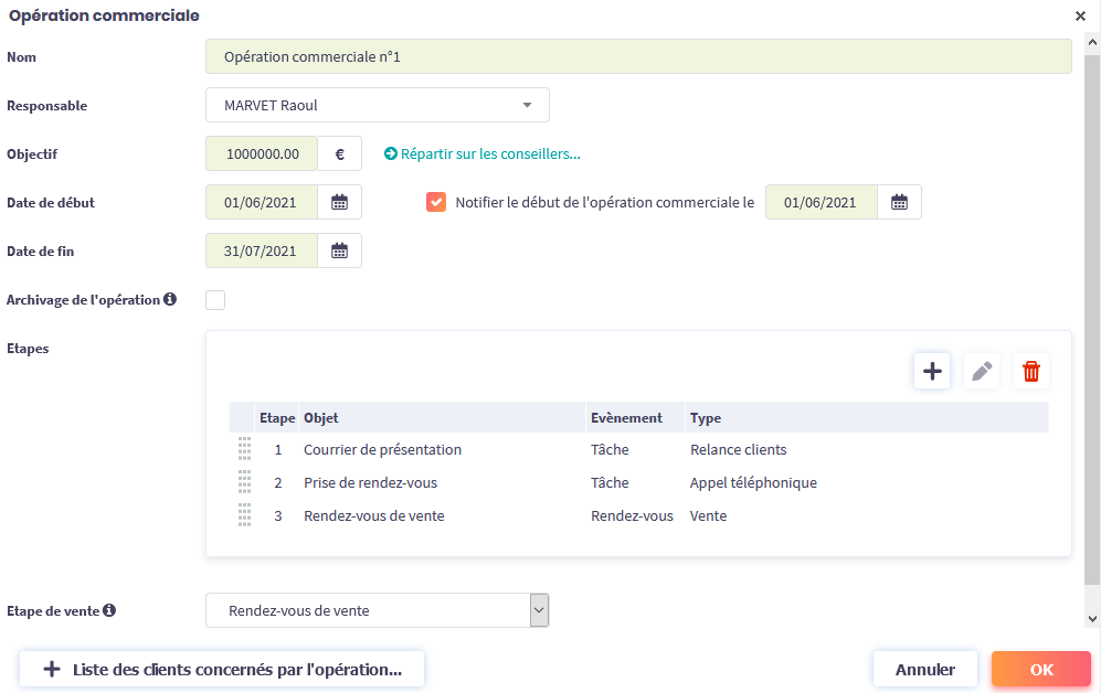Pour créer une opération commerciale, vous devez au minimum lui donner un nom, renseigner une date de début et de fin, et définir au moins une étape (qui devra constituer l’étape de vente). L’objectif chiffré, la répartition sur les conseillers et l’affectation de l’opération commerciale à des clients peuvent être réalisées ultérieurement.