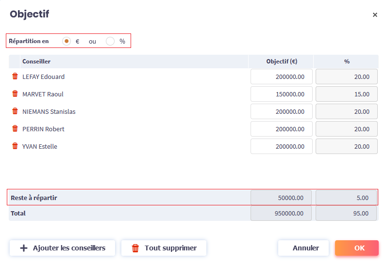 L’objectif d’un conseiller supprimé est automatiquement attribué à la ligne « Reste à répartir ».