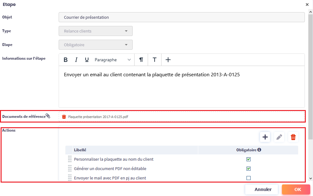 Une étape peut elle aussi revêtir un caractère obligatoire ou facultatif ; cette caractéristique va avoir un impact dans l’opération menée au niveau du client. Aucune étape ne pourra être saisie tant qu’une étape obligatoire préalable est manquante dans le suivi de l’opération commerciale d’un client. Au contraire, une étape facultative manquante ne sera pas bloquante pour pouvoir saisir une étape suivante.