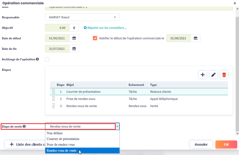 Vous devez donc ajouter une à une les étapes, au gré de l’avancement de l’action commerciale, pour chaque client dont vous êtes en charge dans le cadre de l’opération commerciale.