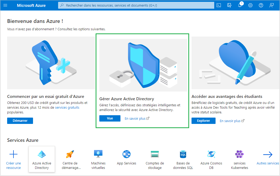Dans Windows, rendez-vous sur votre portail Microsoft Azure, puis cliquez sur Gérer Azure Active Directory – Vue.