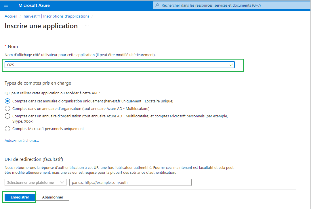 Dans la page Inscrire une application, saisissez O2S dans la zone Nom, puis cliquez sur Enregistrer.