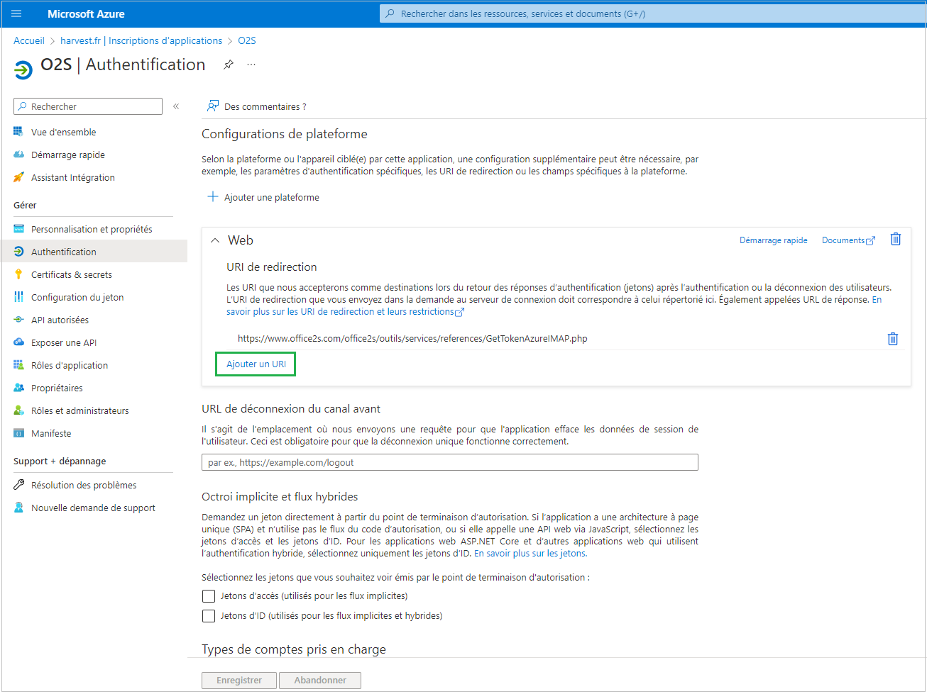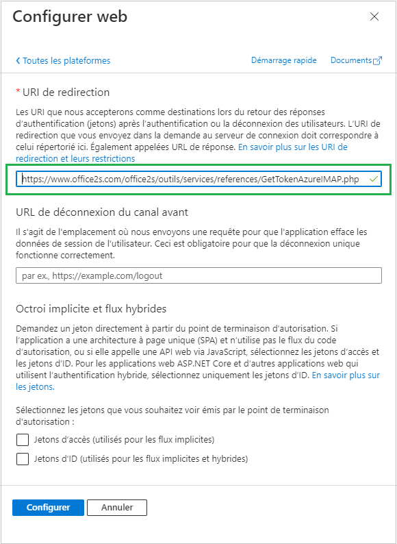 Dans le volet Configurer web, section URI de redirection, renseignez l’URI suivant (dédié au protocole IMAP) :