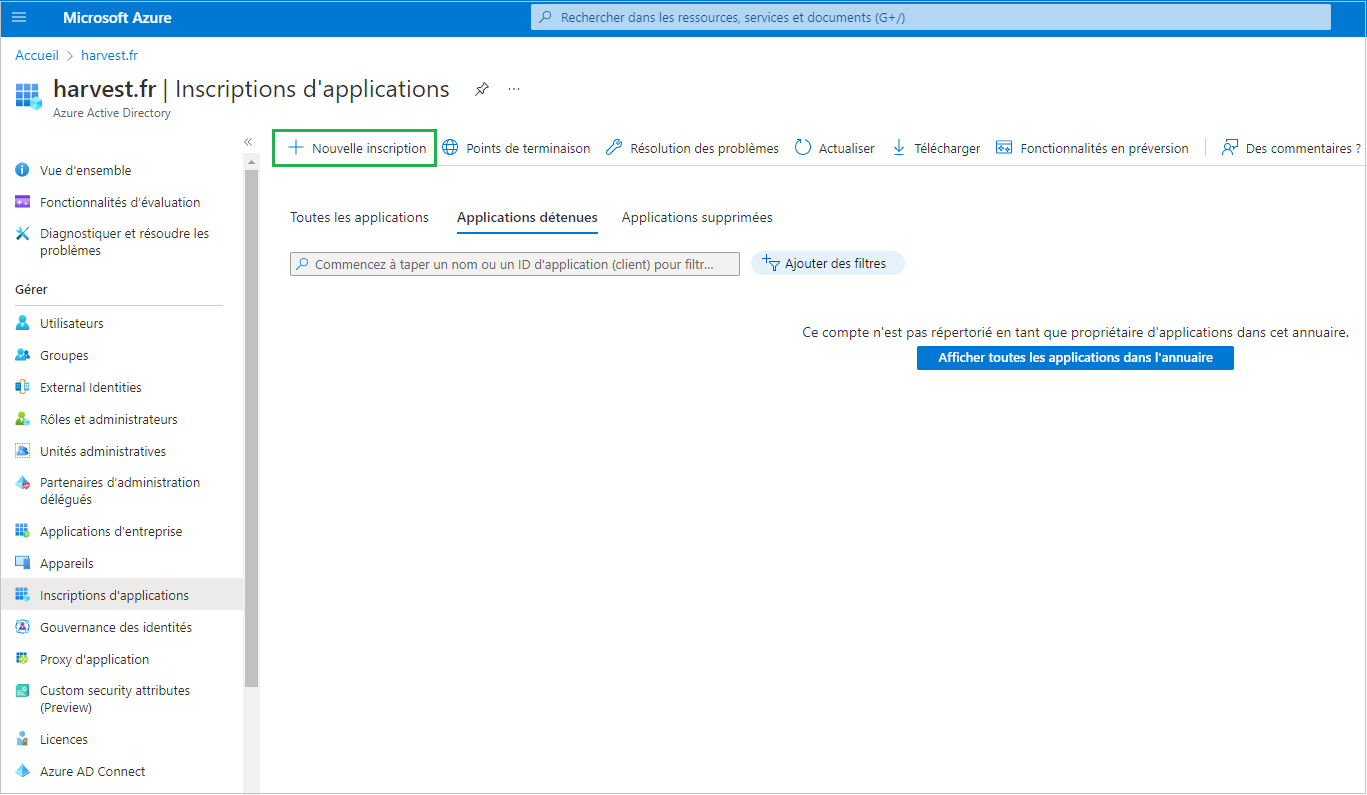 Dans la page Inscriptions d’applications, cliquez sur + Nouvelle inscription.