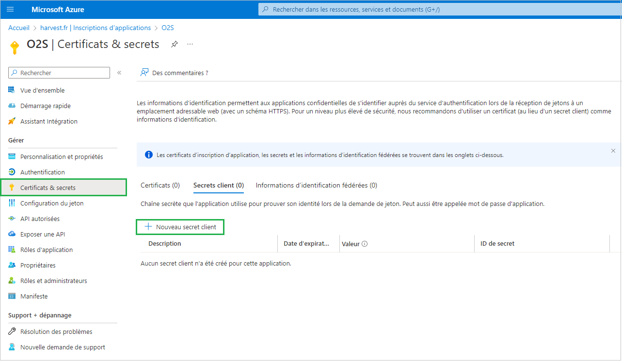 Cliquez sur Certificats & secrets dans le menu latéral puis cliquez sur + Nouveau secret client.