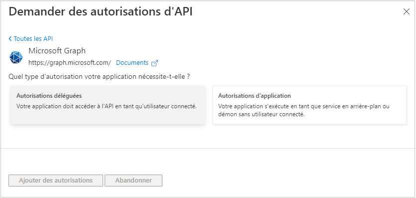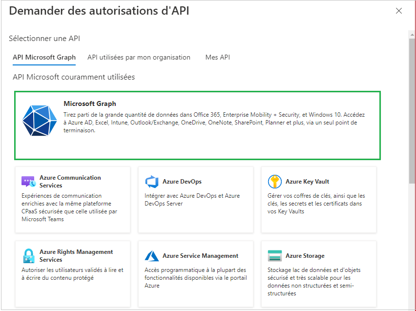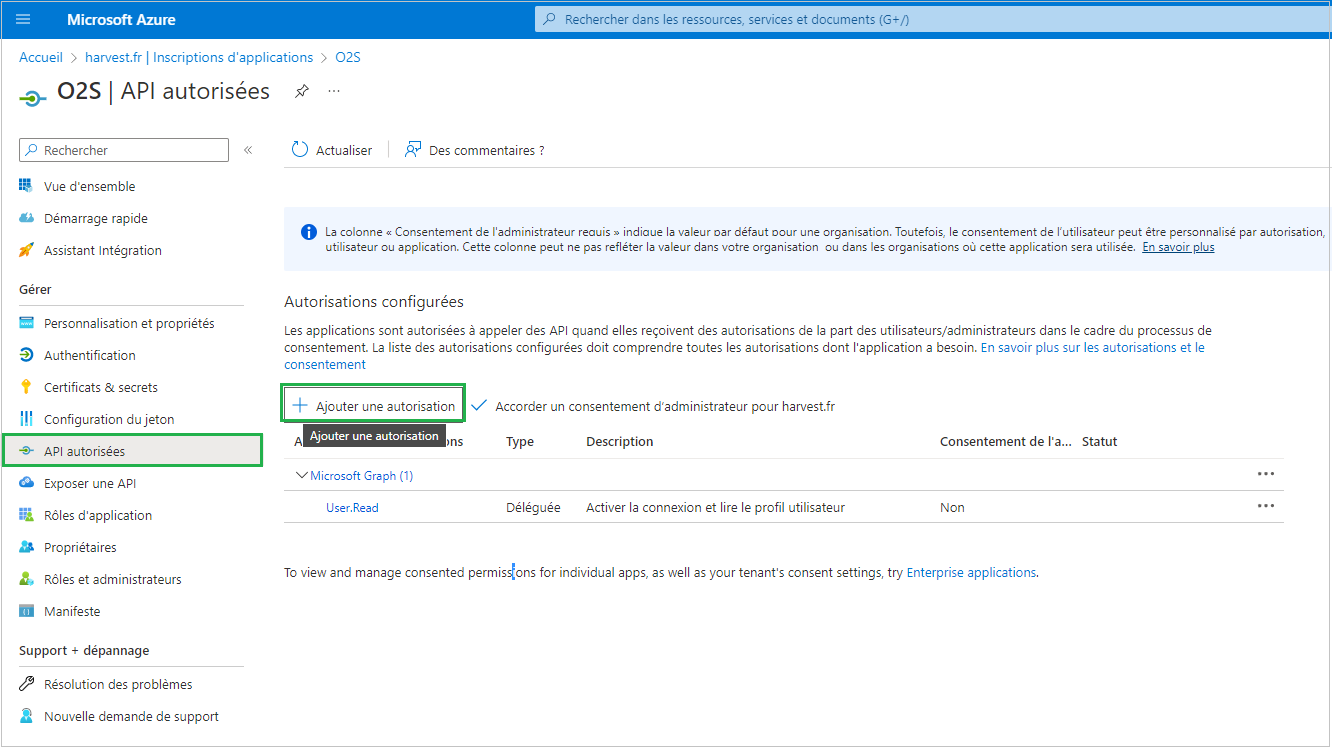 Dans le menu latéral de Microsoft Azure, cliquez sur API autorisées puis sur + Ajouter une autorisation.