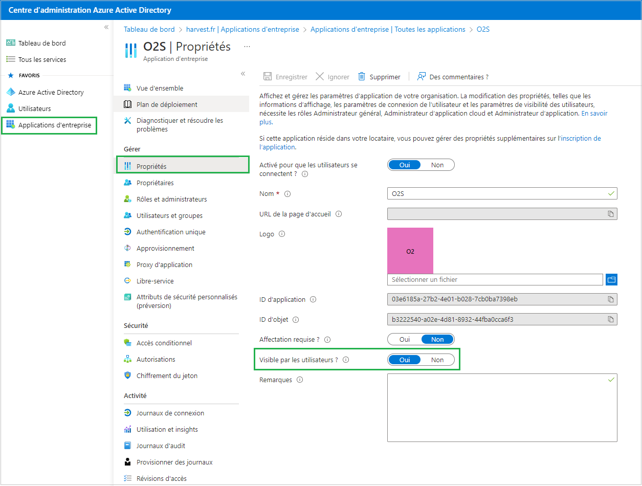 Dans ce cas, depuis les Applications d’Entreprise, rendez-vous dans les propriétés d’O2S et cliquez sur Oui au niveau de Visible par les utilisateurs.