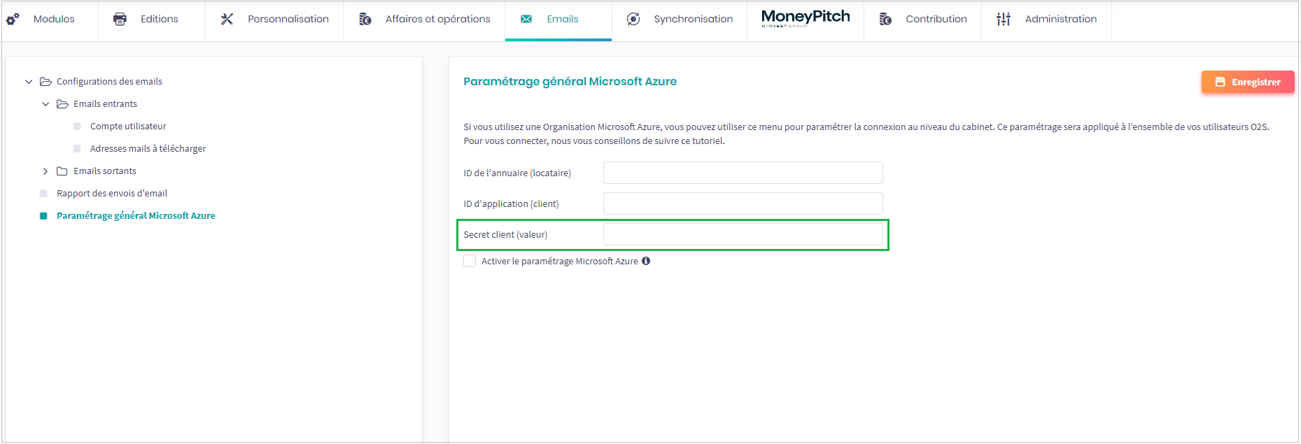 Dans O2S, rendez-vous dans Services > Emails > Paramétrage général Microsoft Azure, et collez la valeur du secret dans le champ Secret client (valeur).