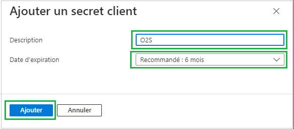 Dans Ajouter un secret client, saisissez O2S dans le champ Description ; laissez la date d’expiration recommandée par défaut.