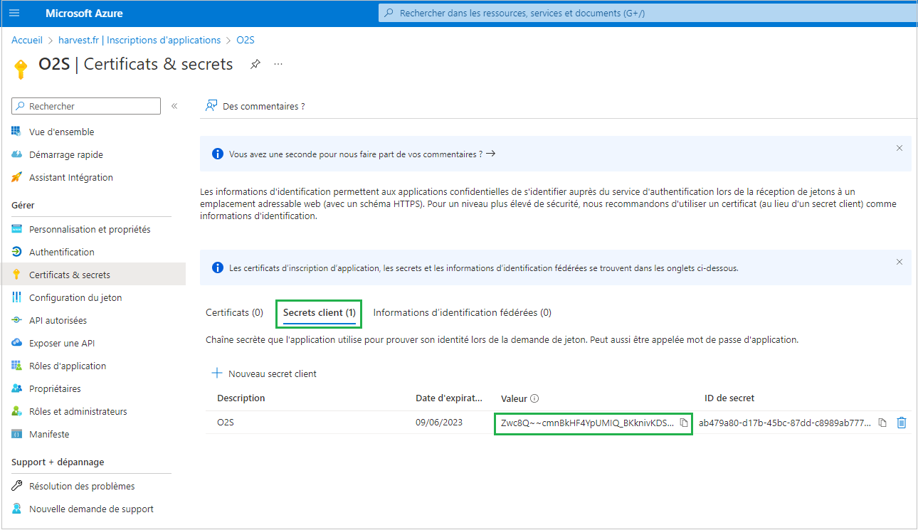 Dans la fenêtre Certificats & secret, onglet Secrets client, copiez la valeur du secret en cliquant sur le bouton situé à droite de celle-ci,