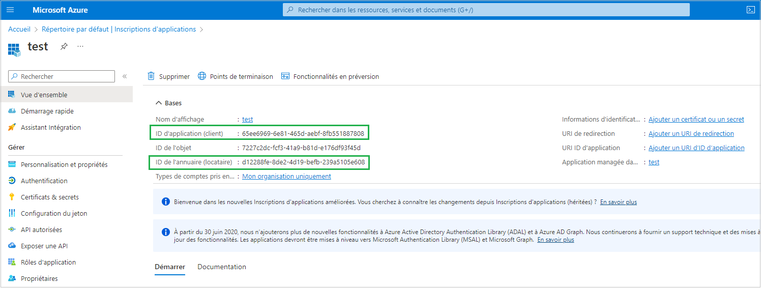Dans la page qui s’affiche, notez bien l’ID Application (client) ainsi que l’ID de l’annuaire (locataire) car vous devrez les renseigner dans O2S.