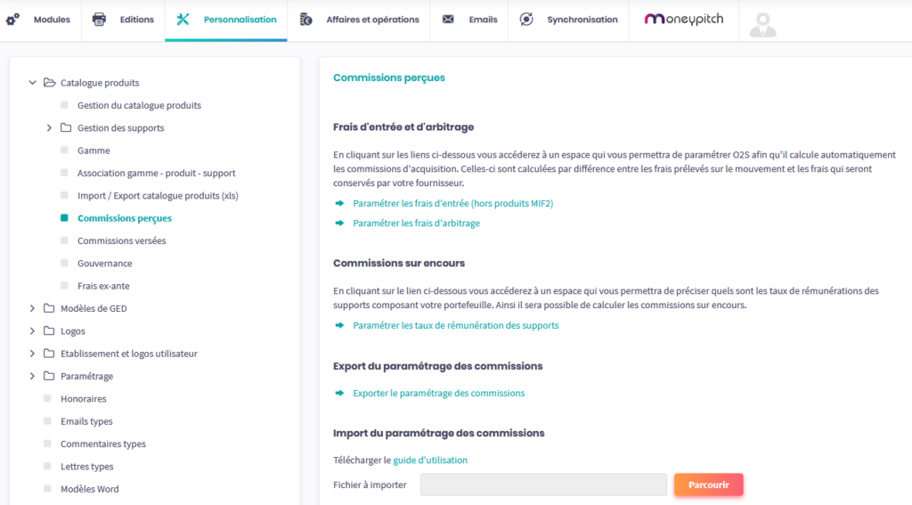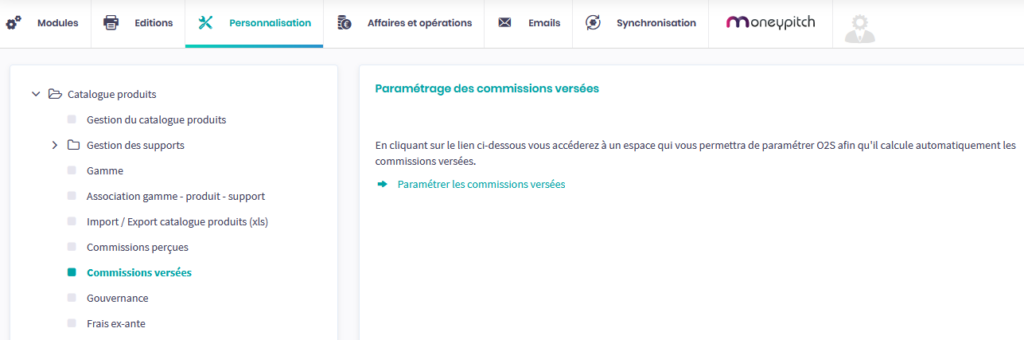 Le paramétrage des commissions perçues s’effectue depuis l’arborescence dans Services > Personnalisation > Catalogue produits.