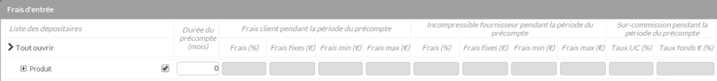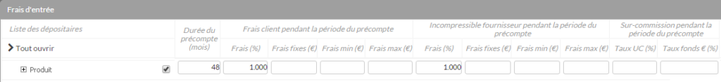 Elle permet de définir la durée du précompte quand cette notion est présente sur un produit. - Les colonnes Frais client pendant la période du précompte et Incompressible pendant la période du précompte :