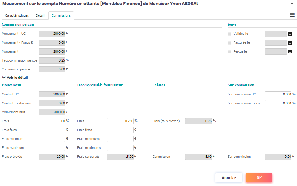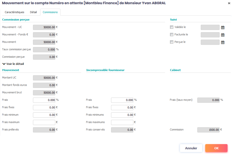 Dans le cas où vous avez indiqué sur un mouvement des frais inférieurs à ceux qui sont paramétrés, alors O2S déterminera automatiquement des commissions réduites. La réduction des commissions sera proportionnelle à la réduction des frais. Ainsi, si vous avez diminué les frais de 50%, alors les commissions versées seront aussi réduites de 50%.