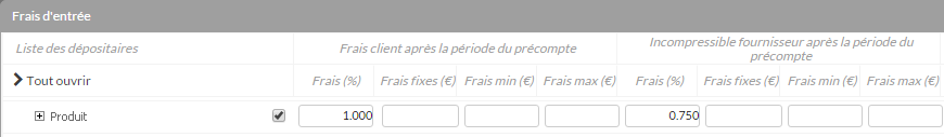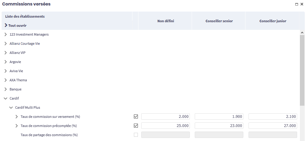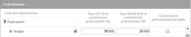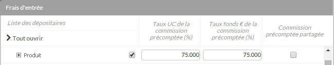 Elles permettent de paramétrer une rémunération complémentaire basée sur le montant des versements programmés et non sur les frais clients et l’incompressible fournisseur. - Frais d’entrée Commission partagée – après la période du précompte :Cette colonne permet de définir si les commissions générées par les VP après la période du précompte seront partagées. Pour plus d’informations voir la partie : Commissions versées.