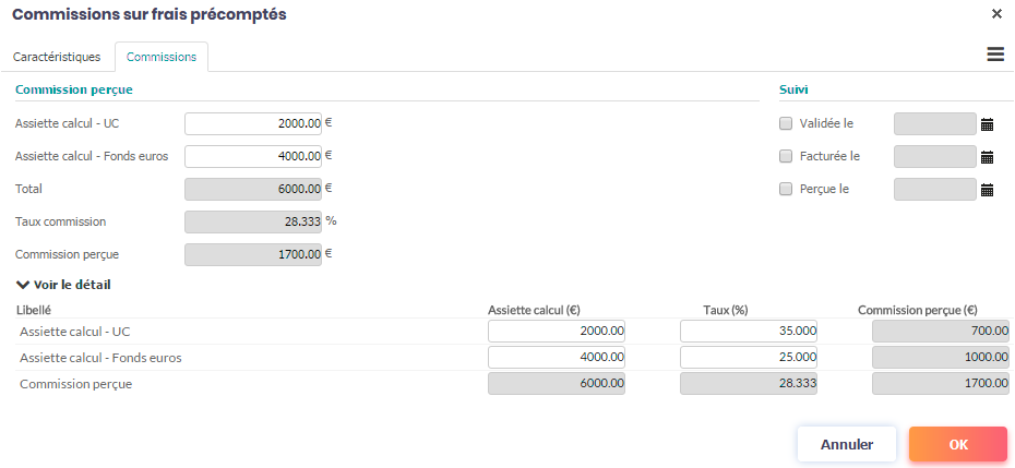 Avec ce paramétrage et un contrat à prime annuelle de 6 000 € dont 2 000 sur les UC et 4000 € sur le fonds euros, O2S détermine une commission précomptée de 1 700 €.