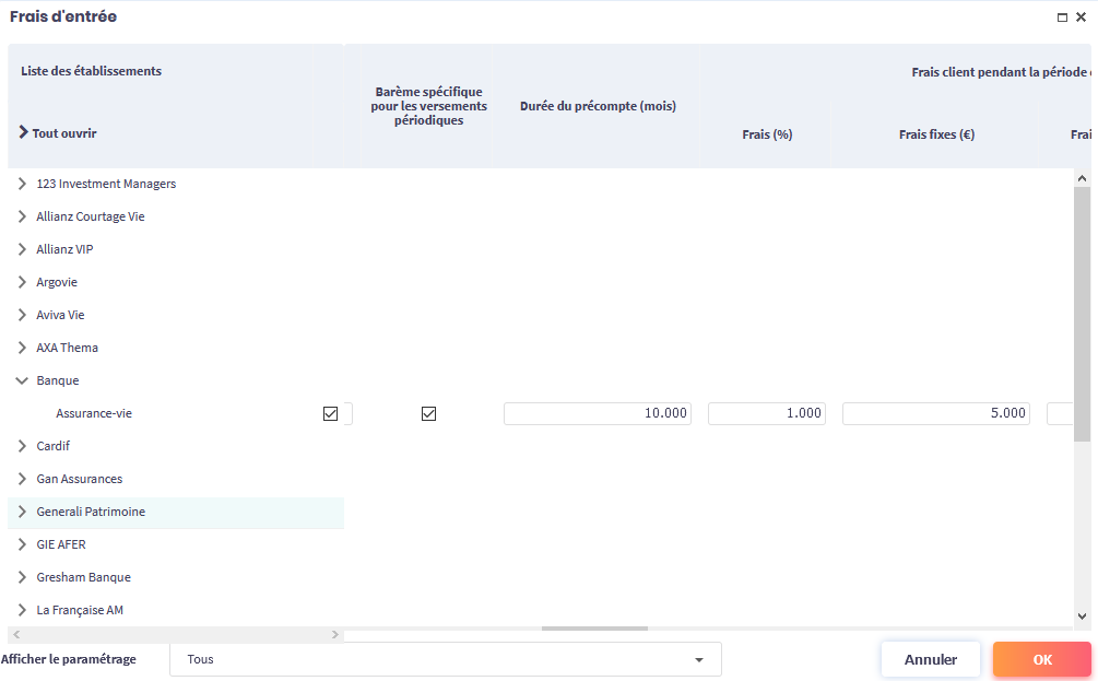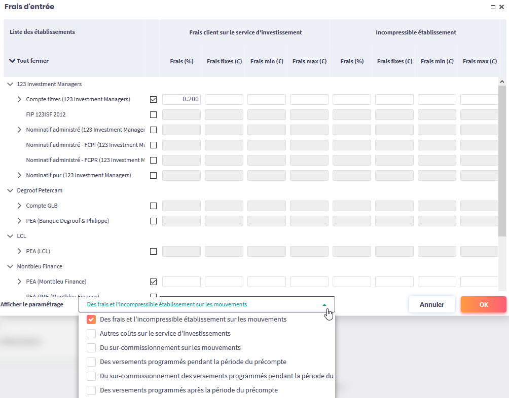 En cliquant sur le lien Paramétrer les frais d’entrée (hors produits MIF2), la fenêtre de paramétrage s’ouvre.