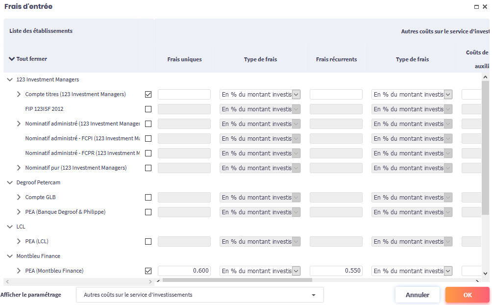Vous pouvez d’une part renseigner les coûts du service d’investissement, et d’autre part, les instruments financiers.