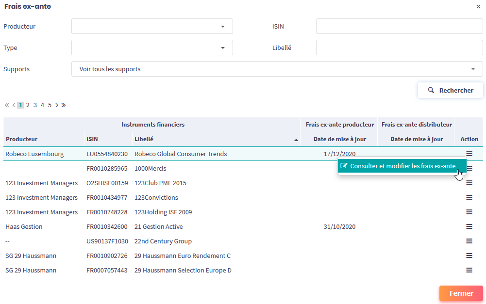 dans la colonne Action de l’instrument dont vous voulez connaitre ou modifier les frais, puis cliquez sur Consulter et modifier les frais ex-ante.