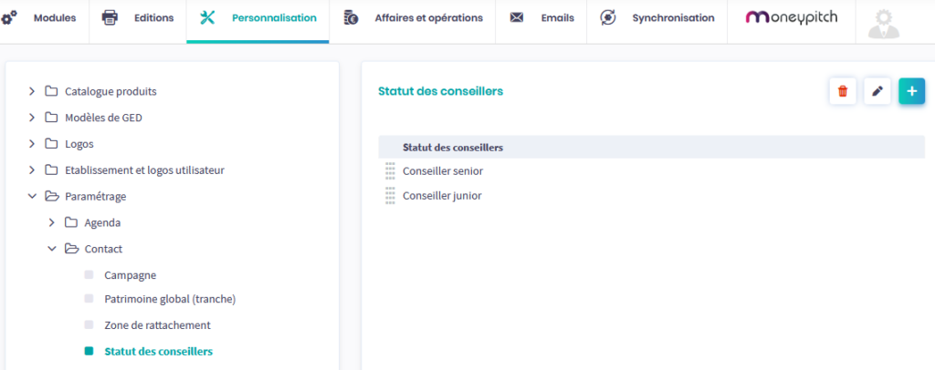 La création des statuts s’effectue dans Services > Personnalisation > Paramétrage > Contact, en cliquant sur
