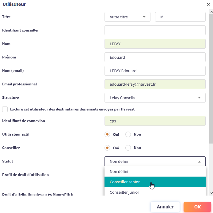 L’affectation d’un statut à un conseiller se réalise dans Services > Administration > Utilisateurs.