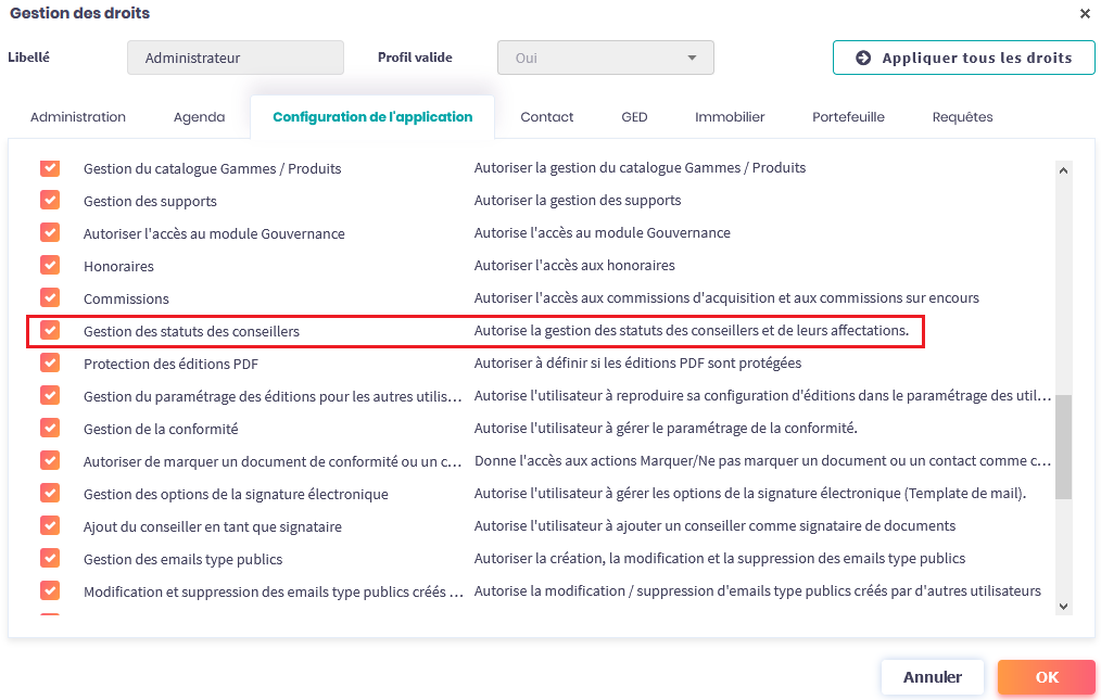 Pour affecter un statut à un conseiller, vous devez disposer du droit de gestion du statut des conseillers (création et affectation des statuts) paramétrable dans Services > Administration > Profils utilisateur > Onglet Configuration de l’application > Gestion des statuts des conseillers.