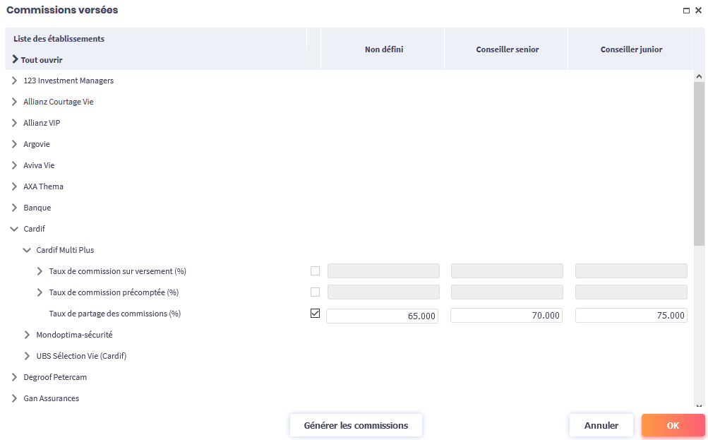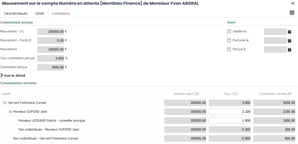 Le barème de rémunération de vos conseillers est basé sur le montant des mouvements. Chaque commission générée sur un produit se partage entre le conseiller et chaque étage de la structure.