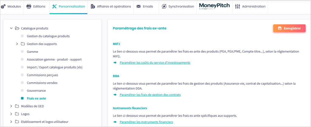 Concernant les produits MIF 2 (Compte-titre, PEA, Livret, Compte en nominatif, PEA-PME), il s’effectue dans la page Services > Personnalisation > Catalogue produits > Frais ex-ante.