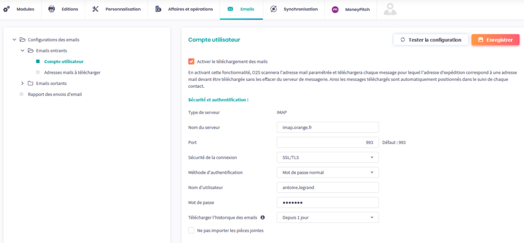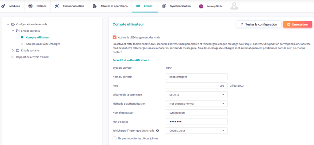 - La récupération dans O2S des emails que les clients vous transmettent sur votre propre adresse email en paramétrant un compte utilisateur en IMAP et une liste d’adresses email à télécharger.
