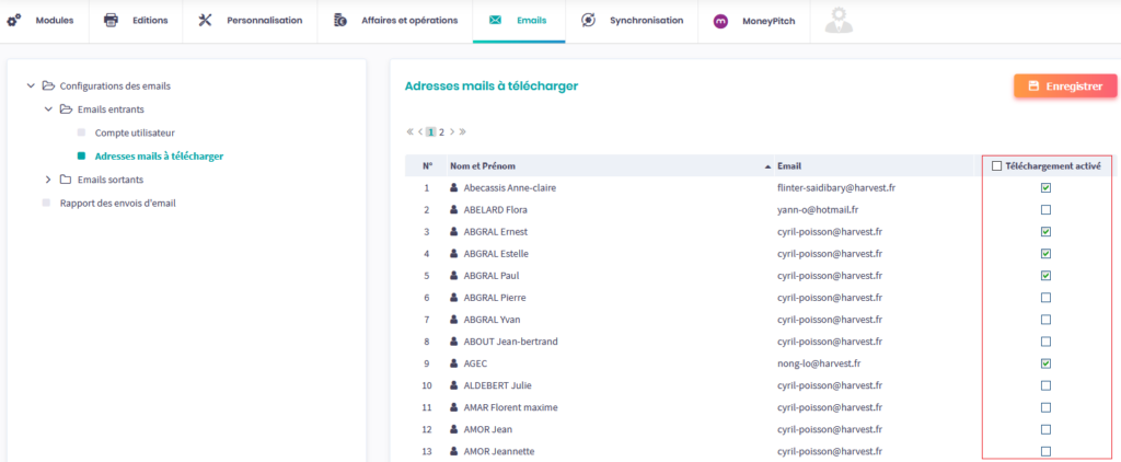 Cochez les adresses email pour lesquelles la fonctionnalité sera activée. Cochez la case Téléchargement activé si vous voulez cocher tous vos contacts en un seul clic. Cliquez sur Enregistrer pour valider.