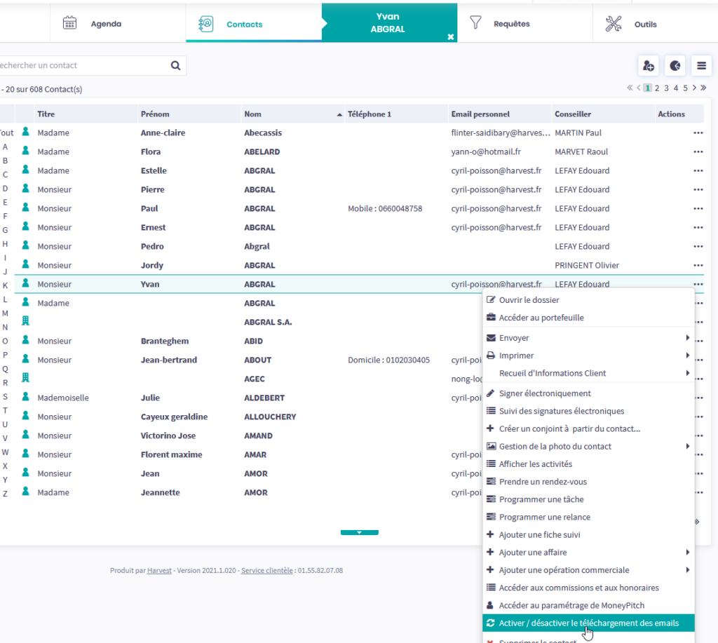 L’usage de cette fonctionnalité est assujetti à un droit d’accès ; celui-ci peut être coché dans le module Administration > Profils utilisateur > profil > Contact > Gestion du téléchargement des emails clients.