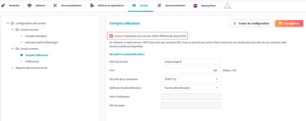 Activer l’utilisation d’un serveur SMTP différent de celui d’O2S
