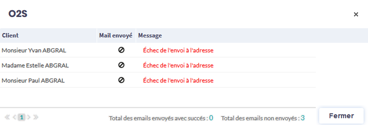 Si vous souhaitez continuer à utiliser le SMTP d’O2S, après chaque envoi d’email, une fenêtre de rapport s’ouvre. Elle vous permet de voir les messages qui sont OK et, en police rouge, les messages posant problème (absence de conseiller, adresse email incorrecte, etc.) :