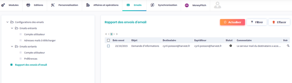 Tous les courriers électroniques que vous recevrez de ces contacts seront automatiquement copiés dans le suivi de ces derniers ainsi que dans la fenêtre des Emails et messages MoneyPitch.