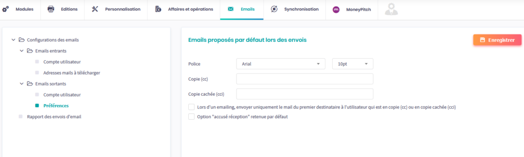Dans la page Configuration des emails > Emails sortants > Préférences, vous pouvez régler certaines options par défaut lorsque vous envoyez des emails.