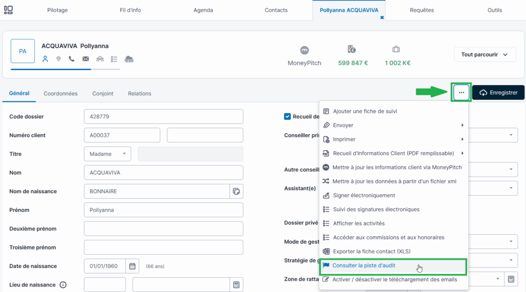 Ce droit n’est activé par défaut que pour les administrateurs. Pour les autres profils, vous devez l’activer dans Administration > Gestion des profils > Profil > Contact > Consulter la piste d’audit des contacts.