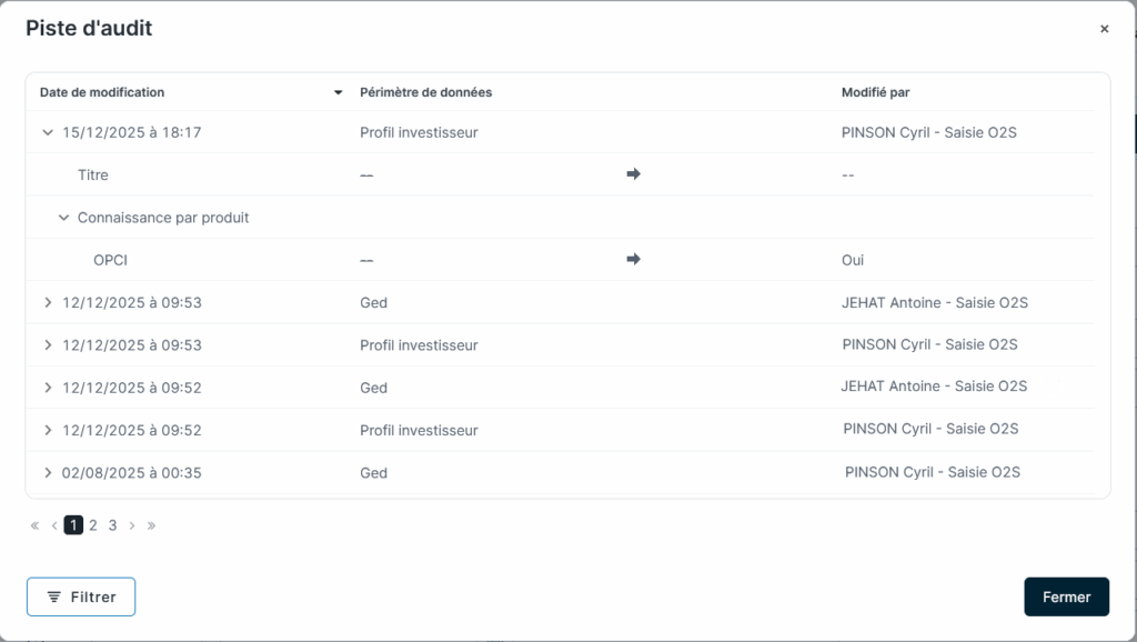 Si la modification provient directement d’un client disposant de MoneyPitch, MoneyPitch Premium ou KYC ou de l’import d’un RIC, cela est indiqué dans la colonne « Modifié par ».