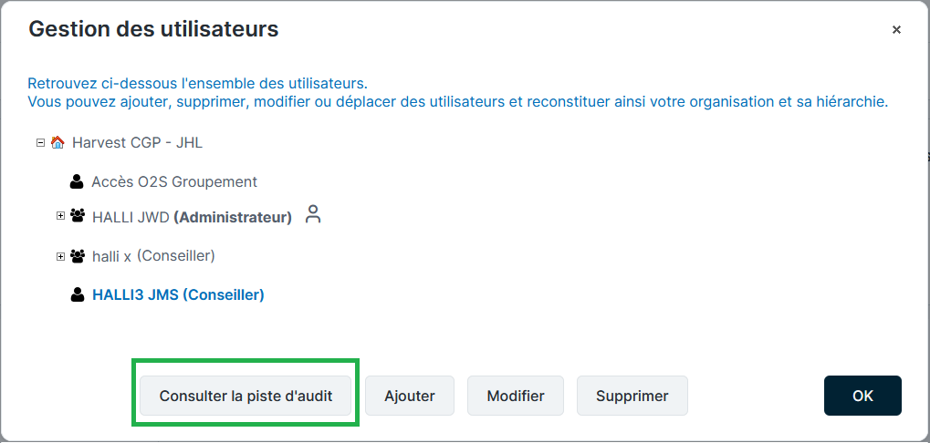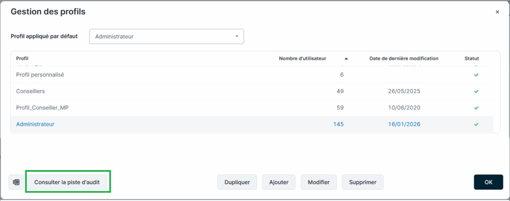Il vous suffit ensuite de sélectionner le profil ou l’utilisateur de votre choix puis de cliquer sur Consulter la piste d’audit.