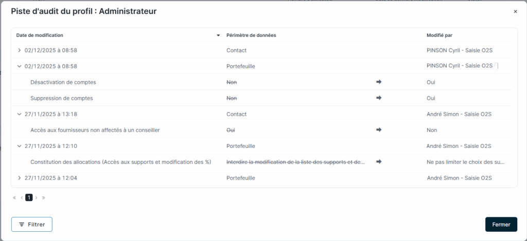 Chaque donnée modifiée est indiquée avec la date de la modification et l’identité de la personne qui en est à l’origine.