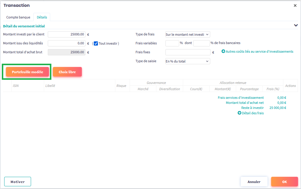 Avant de créer vos portefeuilles modèles, il est impératif que votre catalogue produits (vos produits et supports, vos modes de gestion et la gouvernance) soit constitués et à jour. De même, vous devez avoir paramétré les frais et commissions.
