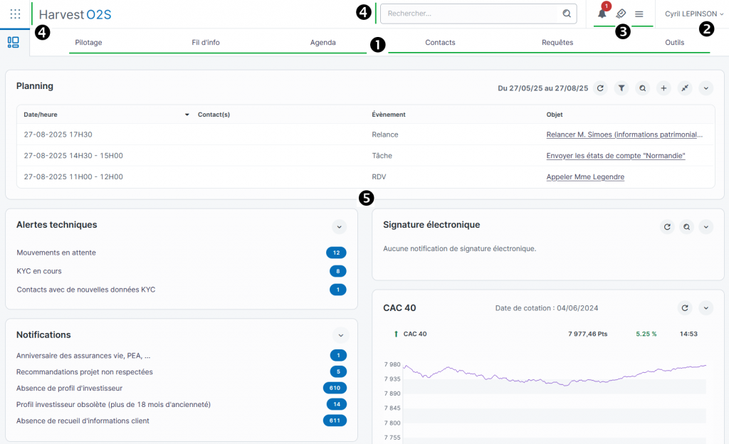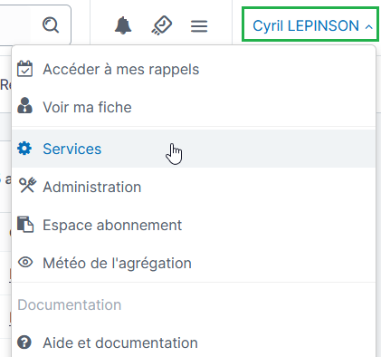 En plaçant le pointeur de la souris sur votre nom en haut à droite d’O2S, accédez à votre propre fiche contact, et à vos rappels de tâches et rendez-vous, ainsi qu’à des supports d’accompagnement pour mieux utiliser O2S (documentation, eLearning, tutoriels, etc..).