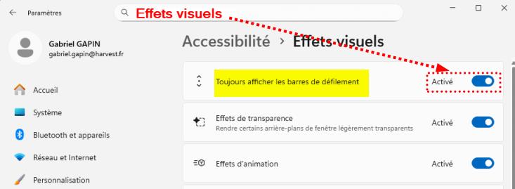 4. Activez l’option Toujours afficher les barres de défilement en basculant le bouton correspondant sur Activé.