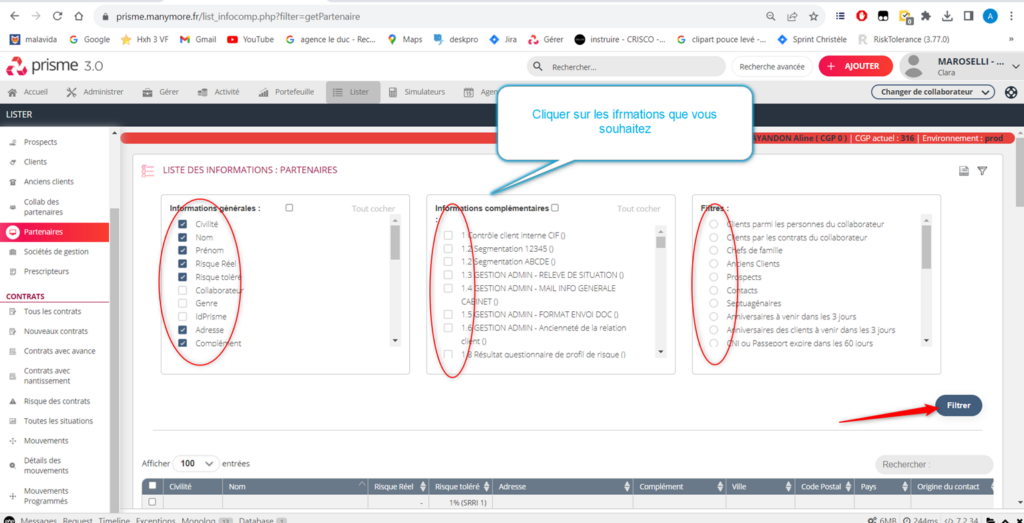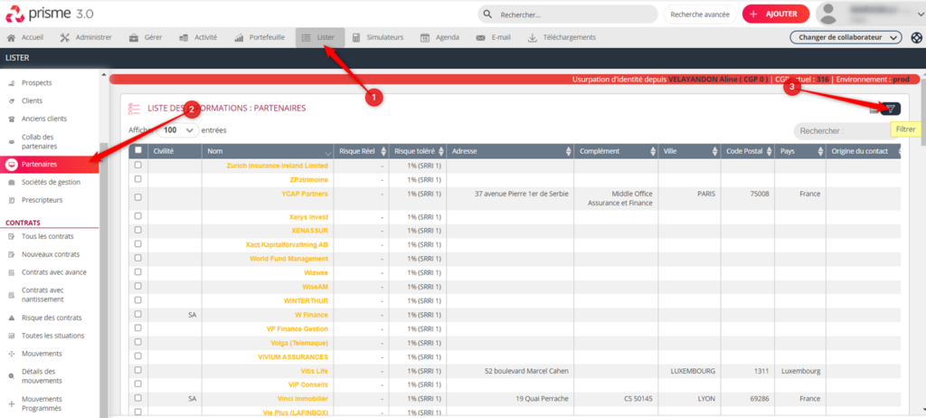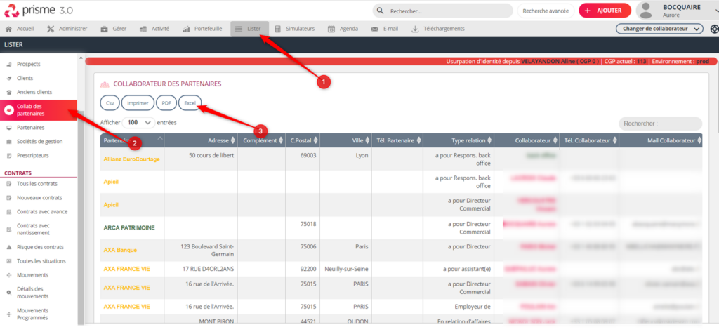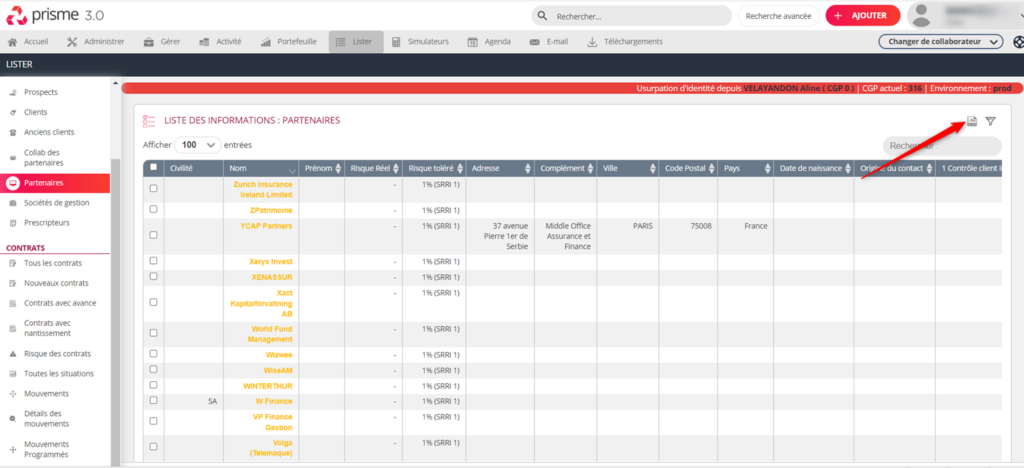 6. Cliquez sur le bouton PDF en haut à droite pour générer la liste des informations partenaires.