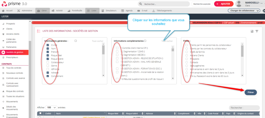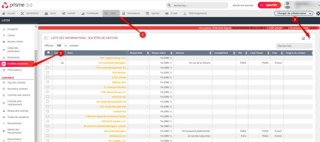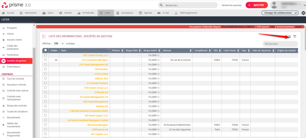 6. Cliquez sur le bouton PDF en haut à droite pour générer la liste des informations sociétés de gestion.