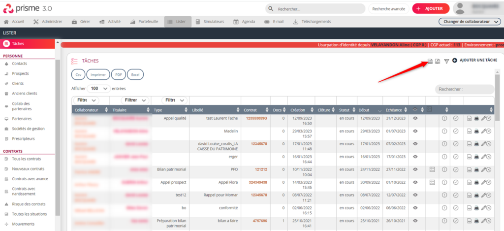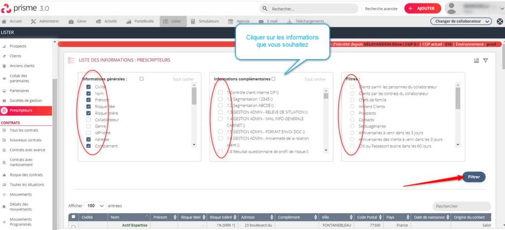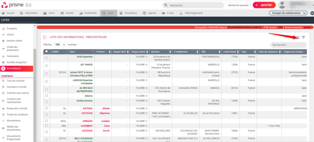 6. Cliquez sur le bouton PDF en haut à droite pour générer la liste des informations prescripteurs.
